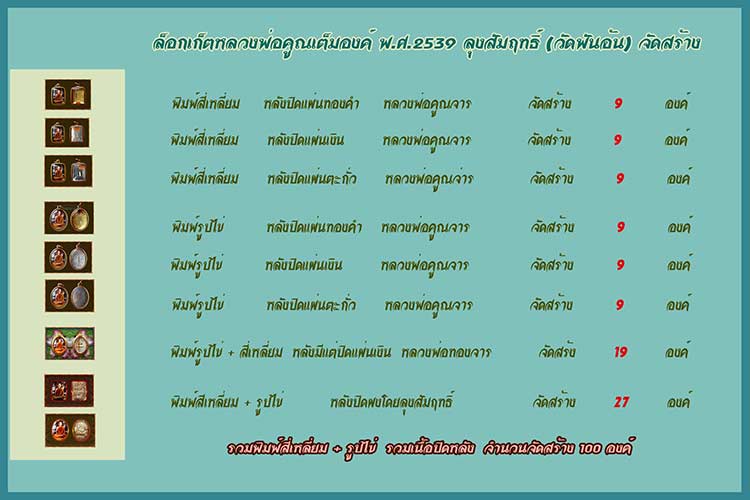 สุดยอดล็อกเก็ตเต็มองค์หลวงพ่อคูณลงจาร ปี ๒๕๓๙ ลุงสัมฤทธิ์(สร้างพระผงวัดพันอ้น)จัดสร้างให้ หลวงพ่อคูณจารครับ.........เริ่มต้นที่สั่งล็อกเก็ตจากโรงงานพิมพ์สี่เหลี่ยม+รูปไข่ทำมา ๑๐๐ องค์.....๑.พิมพ์สี่เหลี่ยมหลังปิดแผ่นทองคำ+เงิน+ตะกั่วอย่างละ ๙ องค์ รวม ๒๗ องค์.......๒.พิมพ์รูปไข่หลังปิดแผ่นทองคำ+เงิน+ตะกั่ว อย่างละ ๙ องค์ รวม ๒๗ องค์....พิมพ์สี่เหลี่ยม๒๗องค์+พิม์รูปไข่๒๗องค์ รวมเป็น ๕๔ องค์ หลวงพ่อคูณจารให้ครบทั้ง ๕๔องค์ เป็นสโลแกนของรุ่นนี้ "จารไปบ่นไป" (หลวงพ่อคูณบ่นเพราะเมตตาที่ลุงสัมฤทธิ์เป็นลูกศิษย์รุ่นยุคแรกสมัยยังหนุ่มๆอยู่ ขณะจารเวลานั้นประชาชนจำนวนมากมารอกราบลพ.คูณที่หน้าห้อง ลพ.คูณจารไปเรื่อยๆก็ถามว่าหมดยังๆ)...ที่เหลือสี่เหลี่ยม+รูปไข่ ๑๙ องค์ปิดแต่แผ่นเงินที่เหลือ ให้พระอาจารย์ทองจารต่อ(ศิษย์เอก ลพ.คูณ) เดี๋ยวต้องถามลุงสัมฤทธิ์ว่าพระอาจารย์ทองจารไปบ่นไปหรือปล่าวว่าทำไม่จารน้อยจัง...๕๕๕....๕... อีก ๒๗ องค์ ลุงสัมฤทธิ์นำไปปิดผงต่อ(ผงสูตรเดียวกับพระผงวัดพันอ้นยุกแรกปี ๒๒-๒๓) รวมแล้วครบ ๑๐๐ องค์.....เพื่อนสมาชิกเข้ามาอ่านประวัติไล่ลำดับการจัดสร้างให้ดี เวลาไปพบเจอที่ไหนจะได้มั่นใจและไม่พลาดในการเช่าเก็บบูชาครับ.......