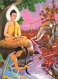 ซึ่งตามพุทธประวัตินั้น ได้กล่าวไว้ว่า ก่อนที่ "สมเด็จพระสัมมาสัมพุทธเจ้า" จะ "ตรัสรู้" ในวันเพ็ญ เดือนหก ณ.ใต้ต้นศรีมหาโพธิ์นั้น "พญามาร" พร้อมด้วย "เสนามาร" ได้ยกพลจำนวนมาก มากีดกัน "สมเด็จพระสัมมาสัมพุทธเจ้า" ไม่ให้ตรัสรู้ โดย "พญามาร" จึงได้เนรมิตแขนมากเป็นพันๆ แขน เพื่อทำการพุ่งรบต่อสู้กับ "สมเด็จพระสัมมาสัมพุทธเจ้า" แต่ ่"สมเด็จพระสัมมาสัมพุทธเจ้า" ได้นึกถึง "บารมี 10 ทัศ" ของพระองค์ ที่ได้เคยบำเพ็ญมาแล้วในทศชาติ (10 ชาติ ก่อนสำเร็จเป็น "สมเด็จพระสัมมาสัมพุทธเจ้า") มี "ทานบารมี" ในชาติสุดท้าย เป็นต้น ฉับพลันนั้น "พระแม่ธรณี" ได้ปรากฏกายขึ้น เพื่อยืนยันถึง "บารมี 10 ทัศ" ที่พระองค์ได้เคยบำเพ็ญมาแล้วในทศชาติ และได้บีบน้ำจากมวยผมให้ท่วม"พญามาร"และ "เสนามาร" ที่มารังควาญ "สมเด็จพระสัมมาสัมพุทธเจ้า" เป็นผลให้พระองค์ทรงเอาชนะ "พญามาร" และ"เสนามาร" ทั้งหมดได้ และสำเร็จเป็น"สมเด็จพระสัมมาสัมพุทธเจ้า" ได้ในวันนั้น