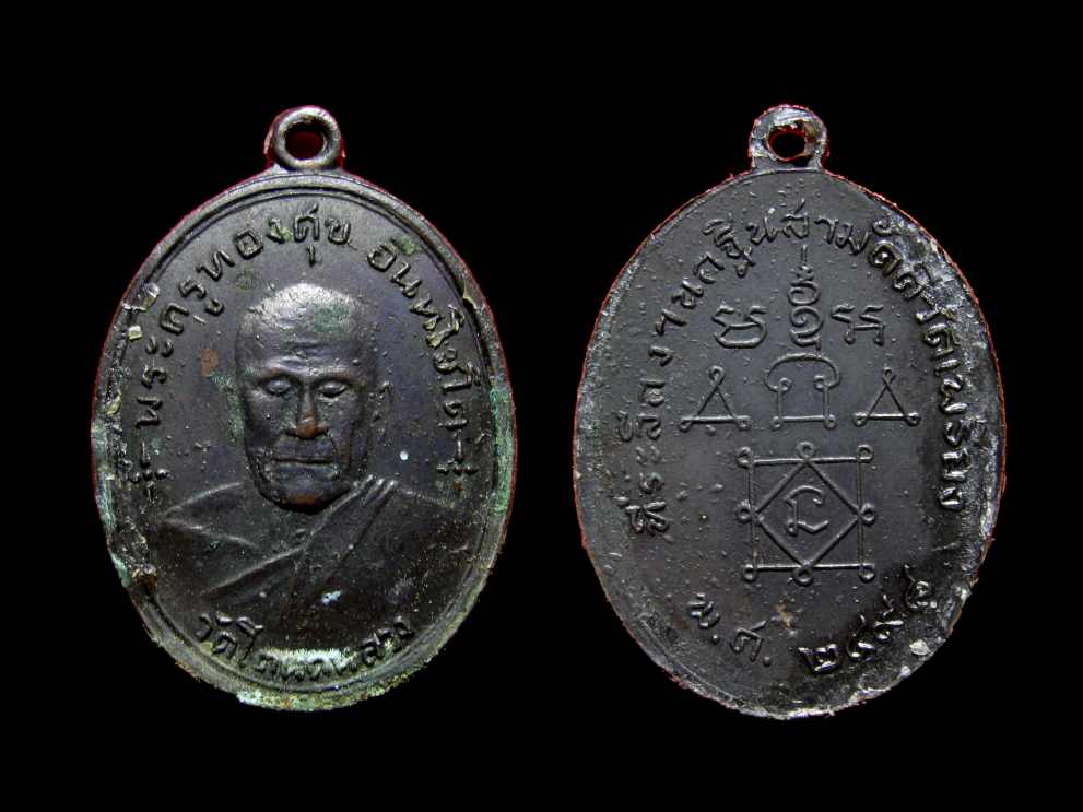 เหรียญหลวงพ่อทองศุข ออกวัเพรียง ปี 2498 ดำปิ๊ด ปี๊ สวยตัวจริง องค์นี้เจ้าของเก่าเลี่ยมทองไว้ จึงมีร่องลอยของเทียนติดอยู่ตามขอบเหรียญครับ