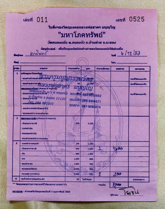 ใบจองวัด เนื้อเงินลงยาราชาวดี เหรียญมหาโภคทรัพย์ หลวงพ่อสาคร
