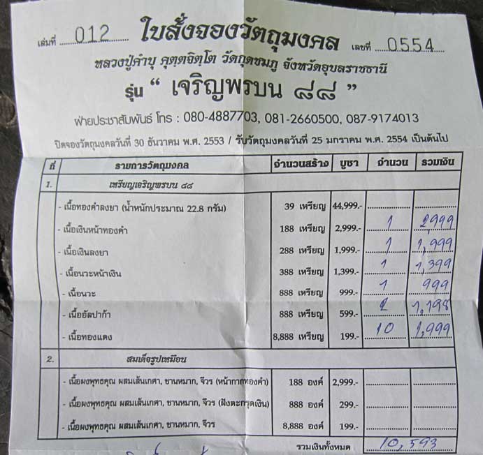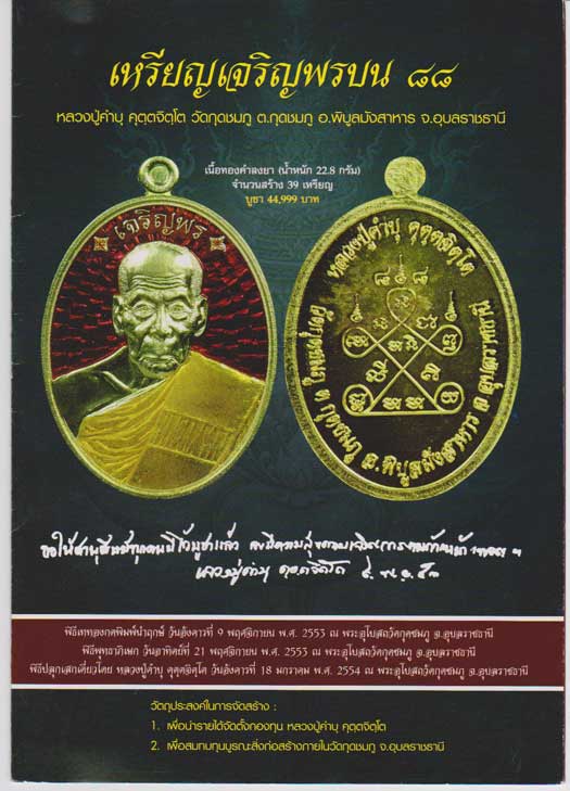 ใบจอง เหรียญเจริญพรบน ๘๘ หลวงปูคำบุ
