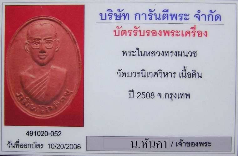 บัตรรับรองพระแท้+ในหลวงทรงผนวช ปี 2508 สวยแชมป์