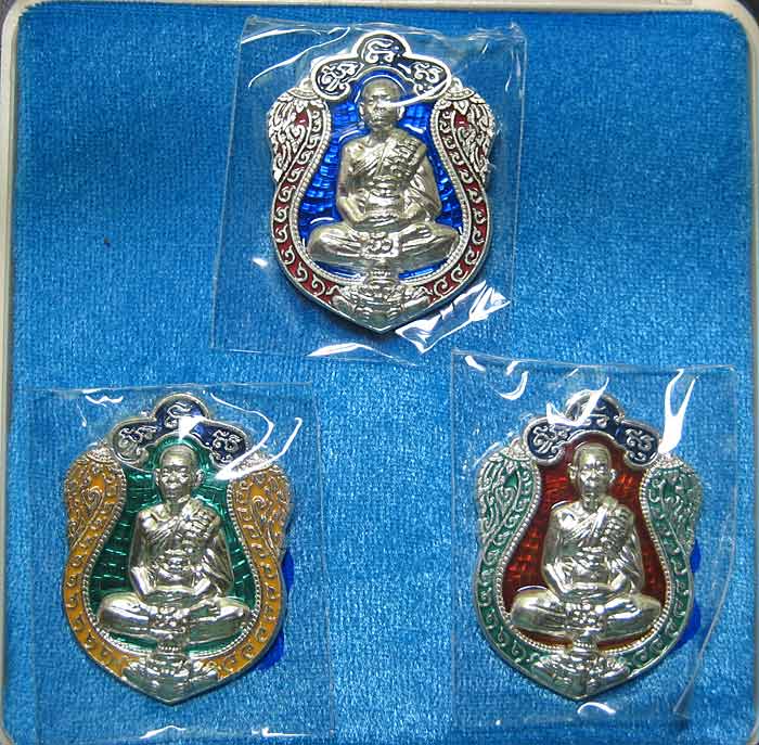 ชุดเนื้อเงิน องค์หลวงปู่ไม่ลงยา ด้านบนลงยาสีม่วง องค์หลวงปู่เงิน (3 เหรียญ) สร้างทั้งหมด 150 ชุด ประกอบด้วย