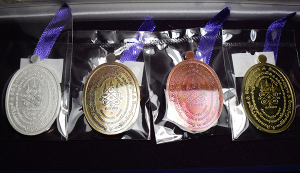 เนื้อเงินลงยาราชาวดีสีแดง ๑ เหรียญ เนื้อนวะหน้าเงิน ๑ เหรียญ เนื้อทองแดงหน้าเงิน ๑ เหรียญ และเนื้อทองฝาบาตรหน้ากากทองแดง ๑ เหรียญ รวม ๔ เหรียญ