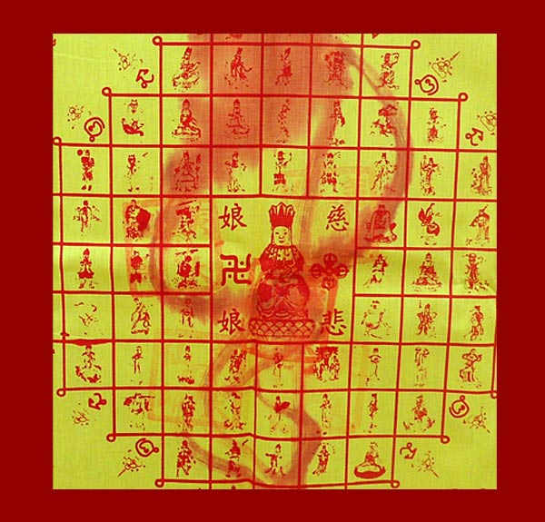 3.รูปพระแม่ตรงกลางผ้ายันต์ใส่ชื่อภาษาจีนที่มุมทั้งสี่ว่า ชื่อปุยเนี่ยวเนี๊ยว