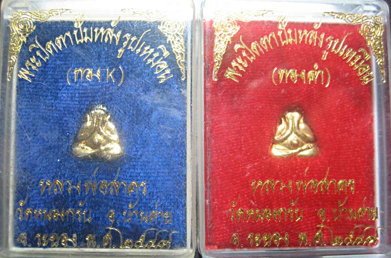 ประกอบด้วย 1.ปิดตาหลังรูปเหมือน เนื้อทองคำ สร้าง 71 องค์ (องค์ซ้ายมือ) หนักประมาณ 2.5 กรัมครับ 2.ปิดตาหลังรูปเหมือน เนื้อทองเค สร้าง 380 องค์ (องค์ขวามือ)
