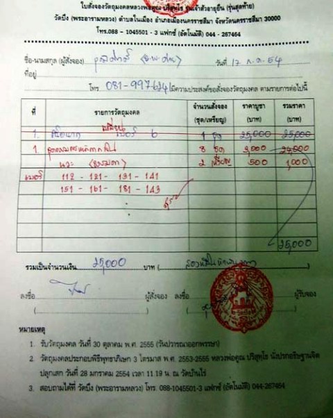 มีใบจอง สาม ใบ รวมยอด 41800 บาท ไม่แบ่ง ปล่อยทั้งหมด คิดค่าจอง 2500 บาท ถ้าต้องการใบจองไปรับพระเอง ลดใหเป็นกรณี พิเศษ โทร 0819976241 (ถ้าไม่มีคนรับไม่ต้องตกใจเดี๋ยวผมโทรหาพรุ่งนี้ครับ) จะนอน ง่วง สุดๆครับ เลขสวยมากแต่จำเป็นต้องการใช้เงิน ครับ ขอบคุณครับ