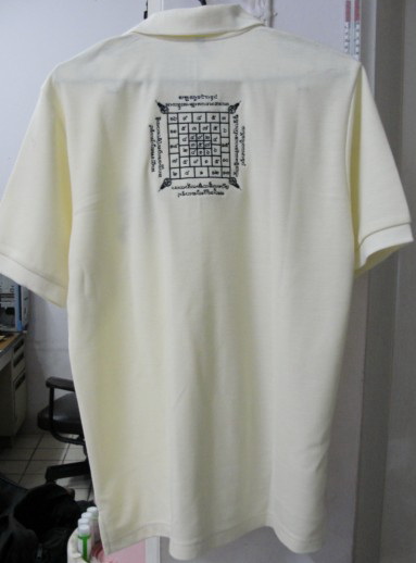 หนุนด้วยแม่ธาตุทั้งสี่ (ดังไฟล์ภาพด้านล่าง) ใต้ปกเสื้อด้านหลังปักยันต์เล็กๆขนาดฝามือ (ไม่ให้ใหญ่นัก เพื่อความลำลองในการใส่ได้หลายสถานการณ์)