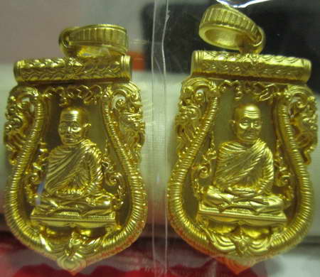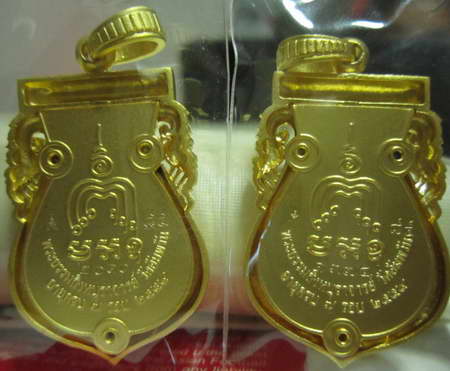 เสมา ๗ รอบ มหามงคล รุ่นแรก เนื้อบรอนซ์นอกชุบทอง พร้อมกล่อง หลวงพ่อจรัญ วัดอัมพวัน ทีเดียว 2 องค์ หมายเลข 2010,1375