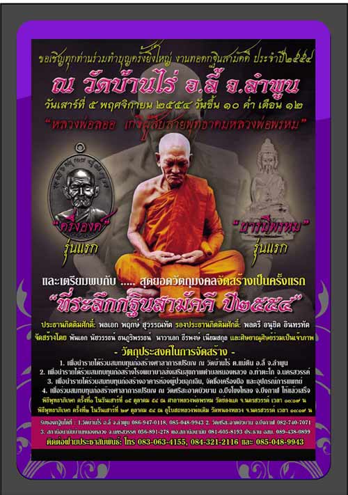 วัตถุประสงค์ในการจัดสร้าง ๑.เพื่อนำรายได้สมทบทุนก่อสร้างศาลาการเปรียญ ณ วัดบ้านไร่ ต.แม่ติน อ.ลี้ จ.ลำพูน