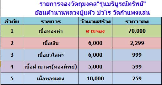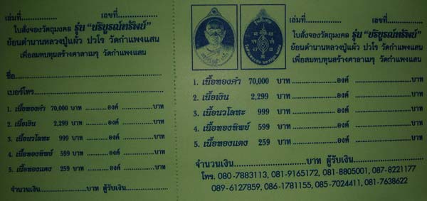 หลวงปู่อนุญาติให้จัดสร้าง เพื่อสมทบทุนสร้างศาลาเมรุวัดกำแพงแสน ย้อนตำนานหลวงปู่กลับไปปลุกเสกวัตถุมงคลและออกที่วัดกำแพงแสนอีกครั้งหนึ่งครับ รูปแบบเหรียญเป็นเหรียญพ่นทรายขัดเงาสวยงามครับ(กำหนดรับวัตถุมงคล 29 พ.ย.-29 ธ.ค.54) จองด่วน มีจำนวนจำกัด