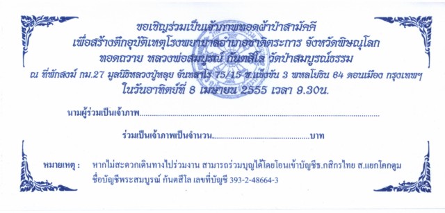 | หัวข้อกระทู้ : ขอเชิญชวนร่วมทำบุญผ้าป่าสามัคคีขอเชิญชวนร่วมทำบุญ ผ้าป่าสามัคคี สร้างตึกอุบัติเหตุโรงพยาบาล ชาติตระก |