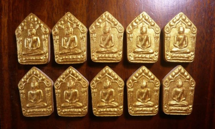 พระขุนแผนยอดฉัตร เนื้อผงพราย ทาทอง ไม่มีตะกรุด พิมพ์ใหญ่ 10 องค์ องค์ละ 450.- ยกชุด องค์ละ 400.-