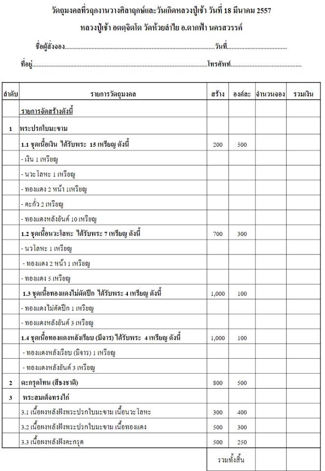 วัตถุมงคลที่รฤกงานวางศิลาฤกษ์และวันเกิดหลวงปู่เช้า วันที่ 18 มีนาคม 2557