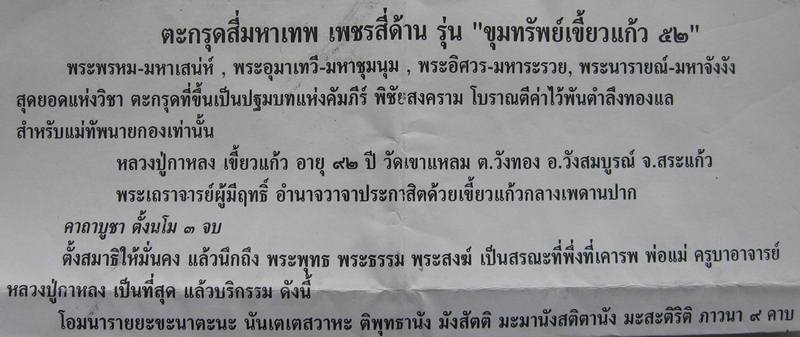ตะกรุด 4 มหาเทพ หลวงปู่กาหลง เขี้ยวแก้ว รุ่น ขุมทรัพย์เขี้ยวแก้ว ปี 52 ( พระพรหม-มหาเสน่ห์,พระอุมาเทวี-มหาชุมนุม,พระอิศวร-มหาละลวย,พระนารายณ์-มหาจังงัง ) ยาว 2.5 นิ้ว แผ่นตะกั่วจารด้วยมือทั้ง 2 ด้าน ถักเชือกลงรักคลุกผงวิเศษ ลงรักปิดทองคำแท้ มีโค๊ดและหมายเลขกำกับทุกดอก