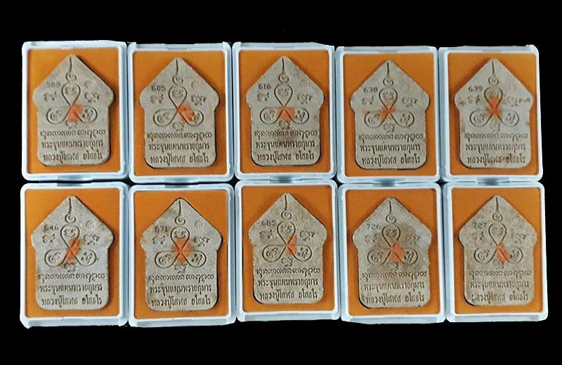 - เนื้อว่านดอกไม้ทอง ตะกรุดเงิน 1 ดอก หมายเลข 588 / 605 / 616 / 638 / 639 / 646 / 671 / 685 / 726 / 727 สร้างจำนวน 3163 องค์ พร้อมกล่องครับ