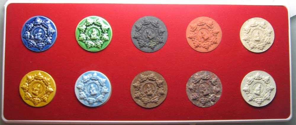 - เนื้อเคลือบสี น้ำเงิน,เหลือง,เขียว,ฟ้า ด้านหลังมียอดครั่ง และประทับหัวยันต์อุ (อุณาโลม)