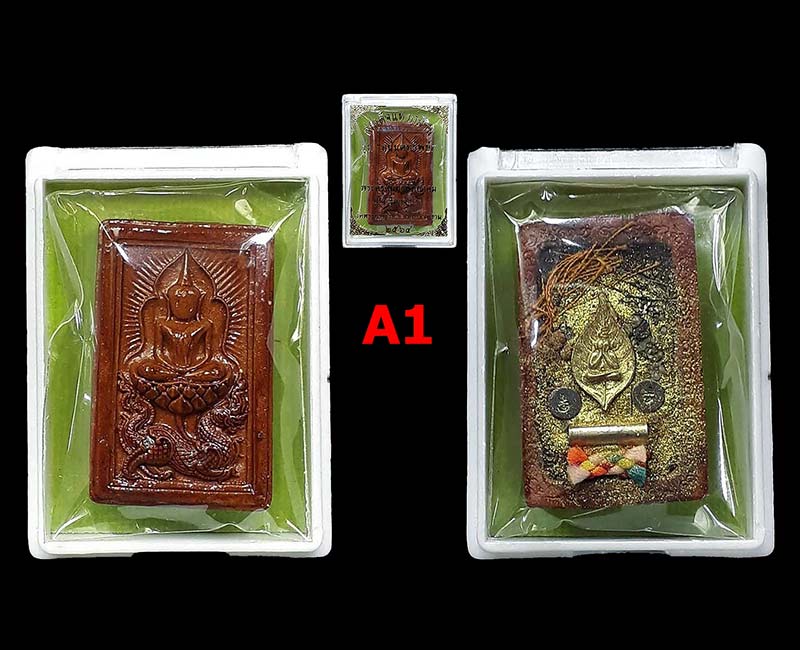 - เนื้อดินผสมผงเคลือบแชล็ค ด้านหลังอุดมวลสารผสมแร่ พร้อมพระปิดตาใบมะนาวเนื้อทองชนวน ตะกรุดเงิน 1 ดอก จีวร เกศา เม็ดพลอย ผงตะไบทอง ไหม 7 สี และเม็ดโค๊ต 2 เม็ด พร้อมกล่องครับ