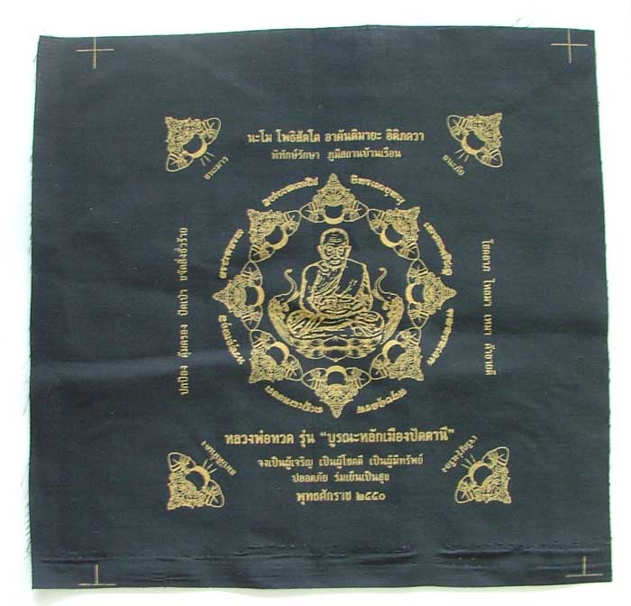 ผ้ายันต์ บูรณะหลักเมืองปัตตานี มีให้เลือก5 สี แดง ดำ น้ำเงิน เหลือง เขียว สวยทุกสีค่ะ จำนวนการสร้างทุกสีรวมกันทั้งหมด 4,000 ผืน ค่ะ