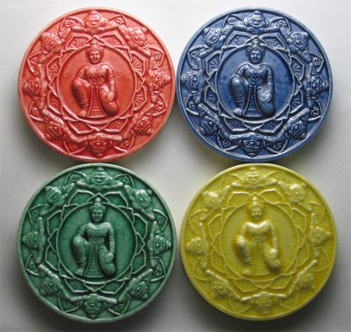 พระผงว่านเคลือบสี 5 ซ.ม. มีสีเขียว, น้ำเงิน, แดง, เหลือง พร้อมกล่องเดิม