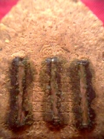วิธีสังเกตุง่ายๆ ในเบื้องต้น ให้ดูจากรูปที่กระผมนำมาลง แล้วลองพิจารณาตามนี้น่ะครับ ถ้่าฝังตะกรุดตอนกดพระ (ก่อน) กับฝังตะกรุดหลังกดพระ (หลัง) จะไม่เหมือนกัน กล่าวคือ ถ้่าฝังตะกรุดตอนกดพระ (ก่อน)เนื้อพระจะ "ปูดโปน" ขึ้นมาห่อหุ้มตะกรุดไว้ ซึ่งลักษณะอย่างนี้จะไม่มีในการฝังตะกรุดหลังกดพระ (หลัง) กล่าวคือ เอารุ่นที่ไม่มีตะกรุดมาเซาะเนื้อพระออก (แล้วเอาตะกรุดมายัดใส่) เนื้อพระจึงไม่"ปูดโปน" จะเรียบๆๆ จะไม่มีเนื้อพระมาห่อหุ้มตะกรุดไว้ อย่างเห็นได้ชัด และตะกรุดจะเป็นคนละแบบกับของจริงมาก กล่าวคือ ของปลอมจะเป็นสีเงินค่อนข้างใหม่ จะไม่มีความเก่าของการที่ได้ผ่านการแช่น้ำมันอาถรรพ์สักนิดเดียว (ถ้าของจริงจะมีไขสีเขียว และตะกรุดสีจะซีดเก่า จะไม่ใหม่เอี่ยม เหมือนของปลอม เนื่องจากอายุพระรุ่นนี้มีระยะเวลาถึง 8-9 ปี แล้ว จะผิดสังเกตมากๆๆครับ ลองสังเกตดูดีๆๆ น่ะครับ อย่าเห็นแก่ของถูกน่ะครับ จะได้ของปลอมไปแขวนไม่รู้ตัว!!!