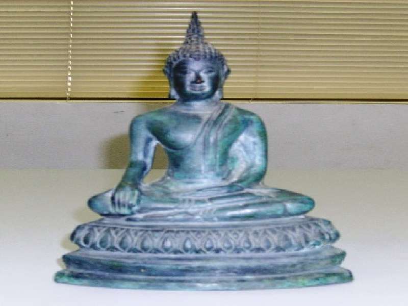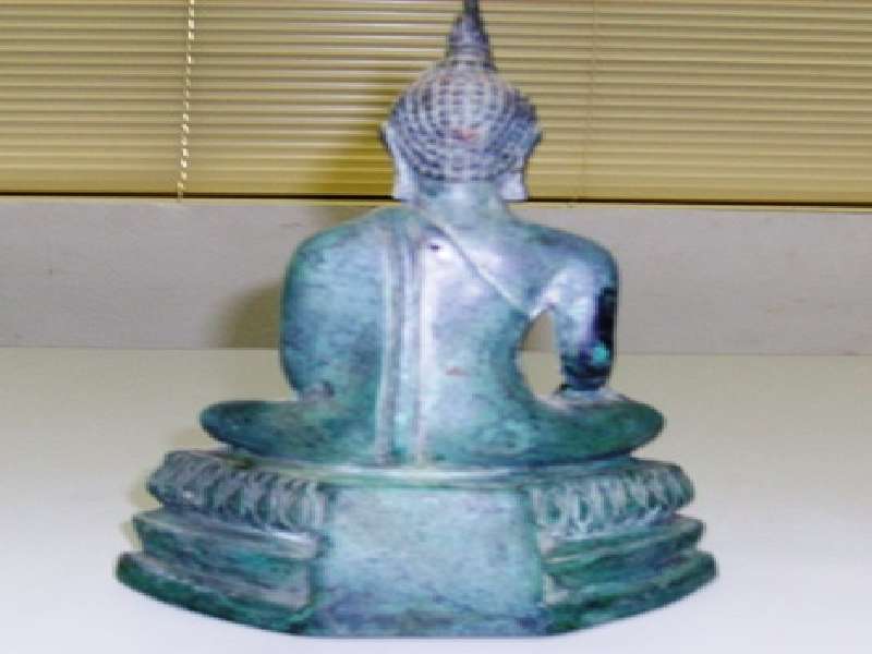 พระบูชาหลวงพ่อสุโขทัย ปางมารวิชัย หน้าตัก 5 นิ้ว เนื้อโลหะ วรรณะเขียวๆดำๆ