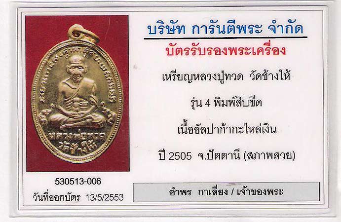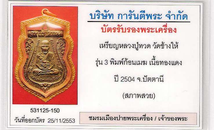 * วันนี้...yasticker ขอนำเสนอ เหรียญหลวงปู่ทวด วัดช้างให้ ที่มีบัตรรับรองพระเครื่อง (สภาพสวย)2 รุ่น