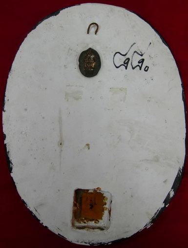 - ด้านหลังส่วนบนฝังผงสุดยอดของหลวงปู่ทิมแล้วปิดทับด้วยเหรียญปรกนาคปรก ๘ รอบ