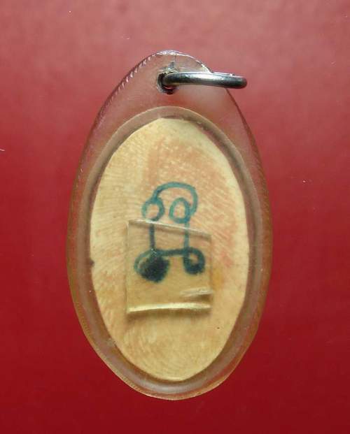 ด้านหลัง เป็นยันต์ นะโม มีลายนิ้วหัวแม่มือของหลวงพ่อประทับด้วยหมึกสีแดงติดอยู่ทุกเหรียญ