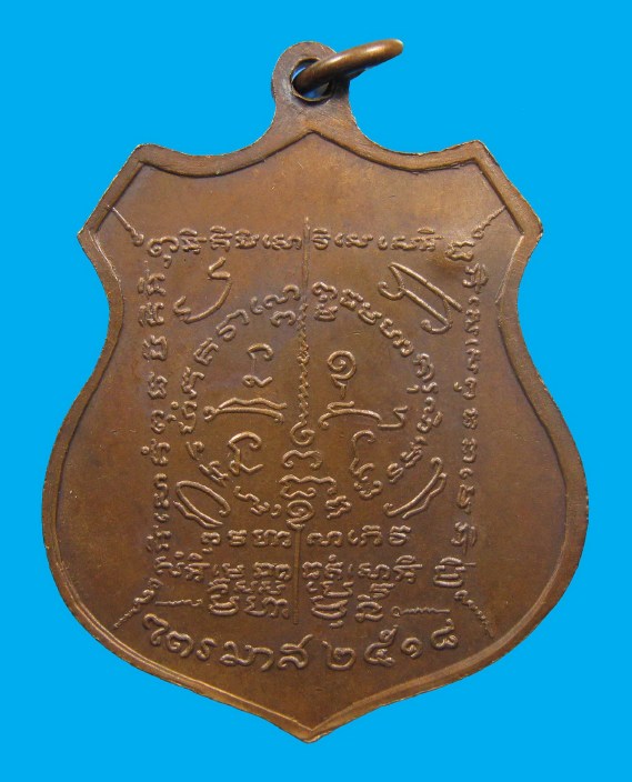 ด้านหลังบรรจุยันต์พุทธเกษตร ต้นแบบมาจากลายมือของท่านเอง ยันต์นี้ท่านคิดประดิษฐ์เองในสมาธิของท่าน" มีอนุภาพครอบจักรวาล "