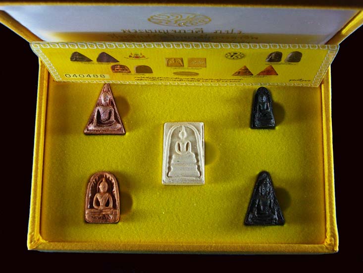 2. ราคา 9,999 บาท เฉพาะองค์กลางที่เป็นสมเด็จ ด้านหน้าจะมีแผ่นทองคำหนักประมาณเกือบ 1 บาทรูปสมเด็จปิดทับอยู่ด้านหน้า และ