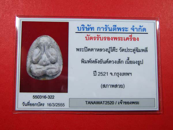 1.พระปิดตาหลวงปู่โต๊ะ วัดประดู่ฉิมพลี พิมพ์หลังยันต์ดวงเล็ก เนื้อผงธูป ปี 2521 กทม ( องค์นี้มีเกศา ด้านหลัง 1 เส้น พร้อมบัตรรับรองฯ ระบุ สภาพสวย )