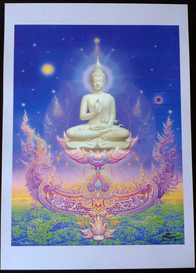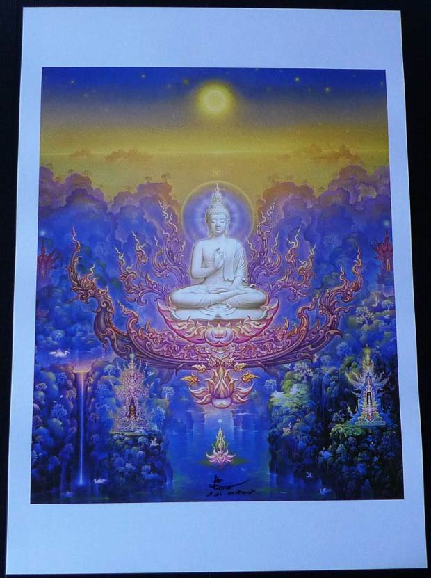 ภาพผลงานของท่านอาจารย์เฉลิมชัยครับ ภาพของท่านอาจารย์นั้นจะแฝงไปด้วยความหมายต่างในภาพ และลวดลายไทยที่วิจิตรบรรจง งดงามที่เป็นเอกลักษณ์ของท่านอาจารย์นั้นได้กลายเป็นต้นแบบและส่งอิทธิพลทางศิลปะไทย ดังที่จะได้เห็นปรากฎในงานศิลปะของศิลปินต่างๆแม้แต่ในรูปแบบของพระเครื่อง |