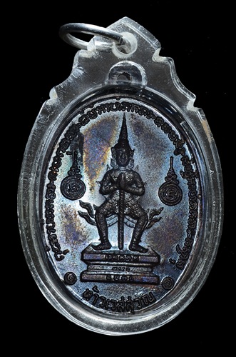 สำหรับที่ด้านหลังต้องเอารูป "ท้าวเวสสุวรรณ" มาประทับไว้ เพื่อเป็นความหมายของการเป็นผู้รักษา และอำนาจ เนื่องจากท้าวเวสสุวรรณนั้น ผู้เป็นหนึ่งในจตุโลกบาล ทางทิศเหนือ เป็นผู้ดูแล ยักษ์ ภูตผีปีศาจ ต่างๆ เป็นเจ้าแห่งทรัพย์สมบัติ เป็นยักษ์ที่ปกป้องดูแลพระพุทธศาสนา ดังนั้นเหรียญนี้จึงมีอานุภาพป้องกันพวกภูตผีปีศาจ แล้วแค้ลวคาดจากอันตราย
